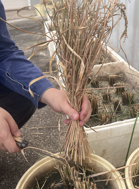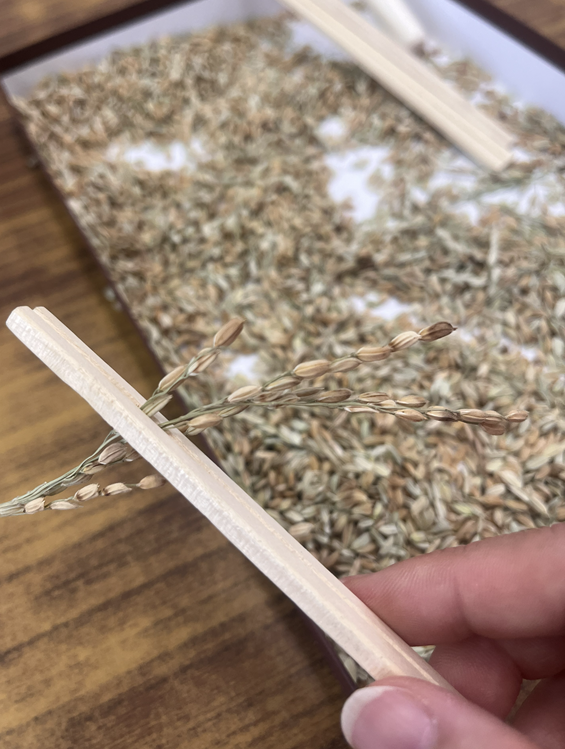 利用者さんと一緒に稲を刈り、割りばしに挟んでお米を取りました。