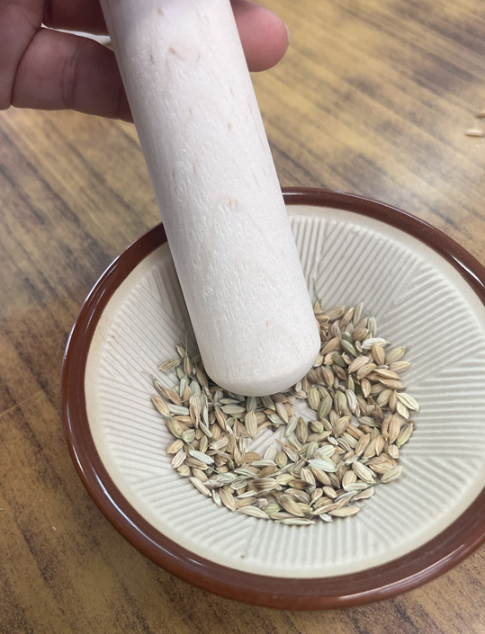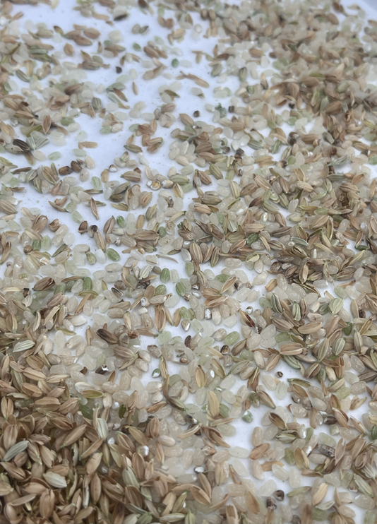 すり鉢に入れてゴリゴリこすると、もみ殻が取れて中からお米が出てきます。